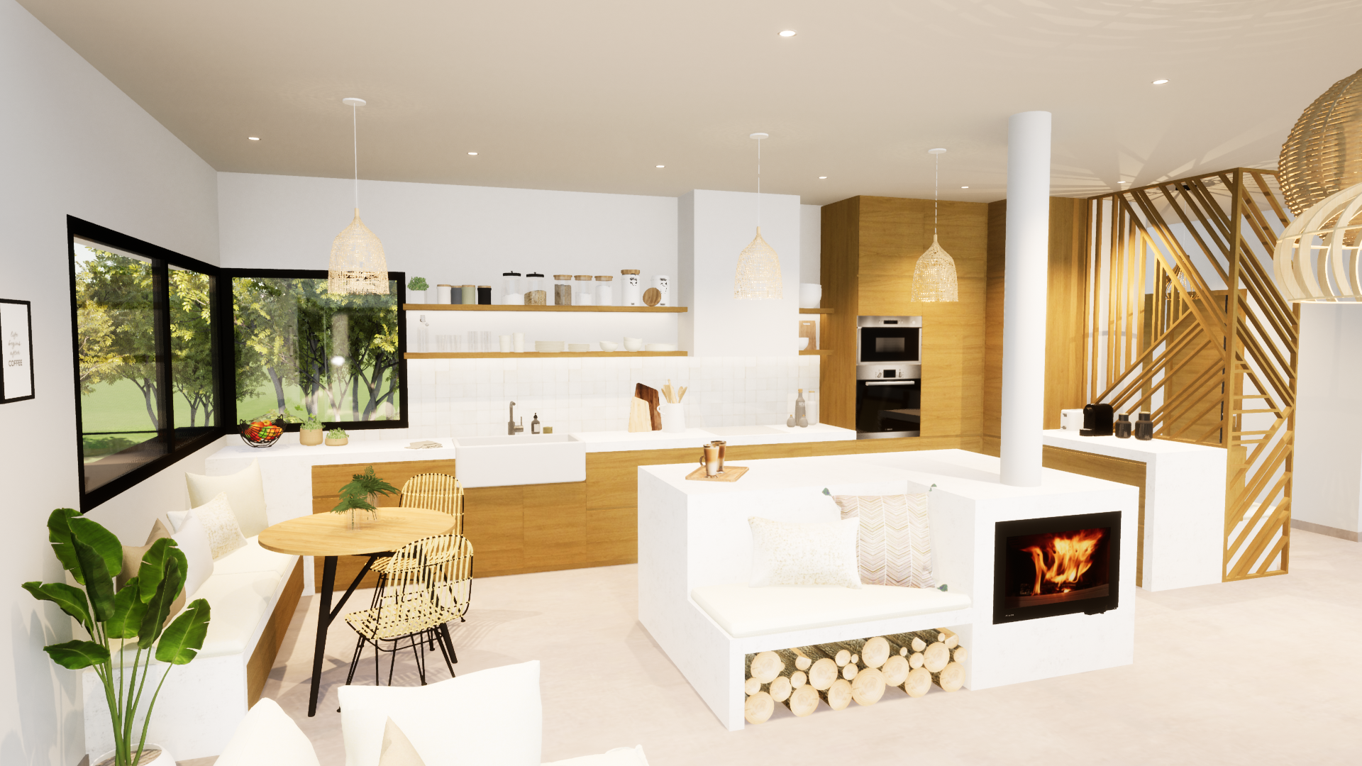 Voici la seconde proposition pour cette villa en Corse, conçu d’après les plans avant construction du bien. Ici la volonté était de redonner de l’espace au salon en inversant celui-ci avec la salle à manger. Le cellier a été supprimé afin de créer un coin repas dans la cuisine.